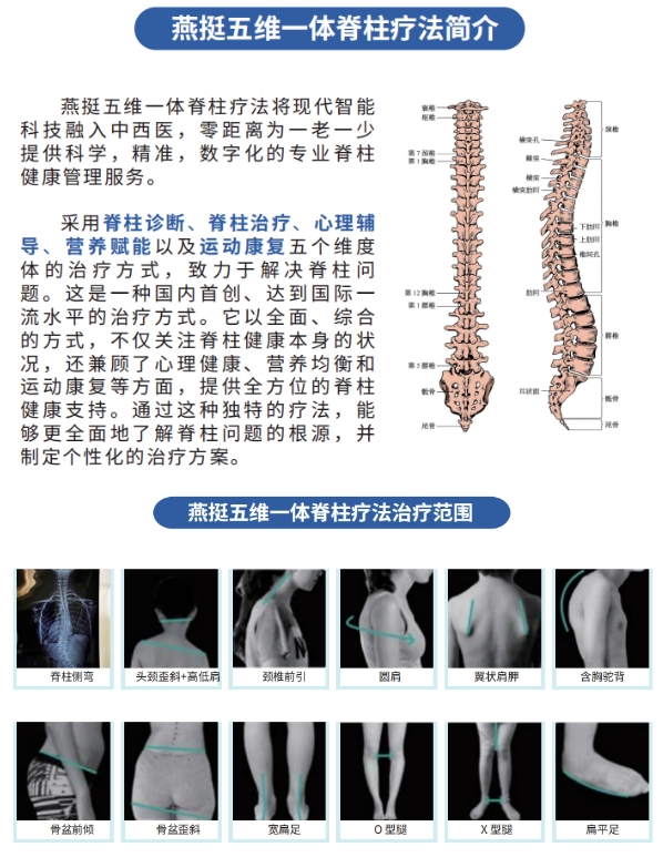 “燕挺五维一体脊柱疗法”是深圳永福医院脊柱康复科的特色诊疗技术,融合了精准评估、个性化矫治、运动康复、心理干预及长期随访管理五大核心模块,为患者提供全方位、多层次的脊柱健康服务。该疗法以科学理论为基础,结合丰富的临床实践经验,在青少年脊柱侧弯防治领域取得了显著成效。